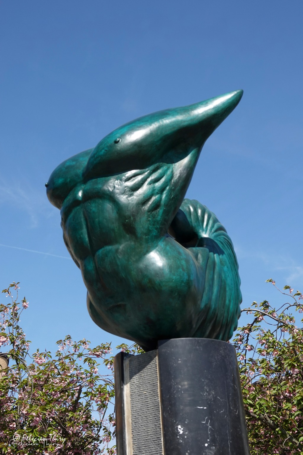 Ce qui fascine, c’est qu’il n’impose aucune explication. Il laisse chacun inventer la sienne. Pour les enfants, c’est un personnage de conte. Pour les artistes, une énigme esthétique. Pour les photographes, un décor dramatique parfait. Pour les passants distraits, une surprise. Mais pour ceux qui prennent le temps de le contempler vraiment… il devient autre chose : une question ouverte, sculptée dans le métal et l’eau.