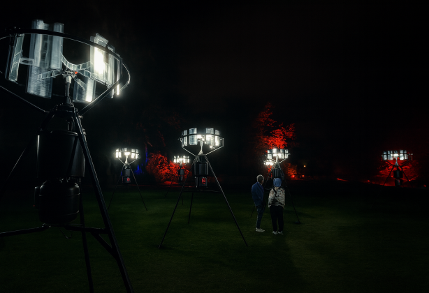 Autres incontournables du parcours, les drôles de bestioles – « Chirping Machines » – de l’artiste japonais So Kanno (°1984) – basé, depuis 2013, à Berlin, détenteur d’une license en beaux-arts, de la « Musashino Art University », au Japon, où il enseigna à la « Aichi University of the Arts » – nous feront dresser les oreilles et écarquiller les yeux, avec ses lasers rouges & verts. Cachés dans le superbe jardin à la française de l’« Hôtel privé de Groesbeeck-de Croix », édifié au XVIIIe siècle, actuel « Musée des Arts décoratifs », ces robots reproduisent les sons de la nature, sans le moindre haut-parleur. Notons que cette symphonie de frottements, imitant criquets, grenouilles ou oiseaux, de manière étonnamment réaliste, dans une installation mécanique et poétique, qui n’est accessible que jusque 17h.