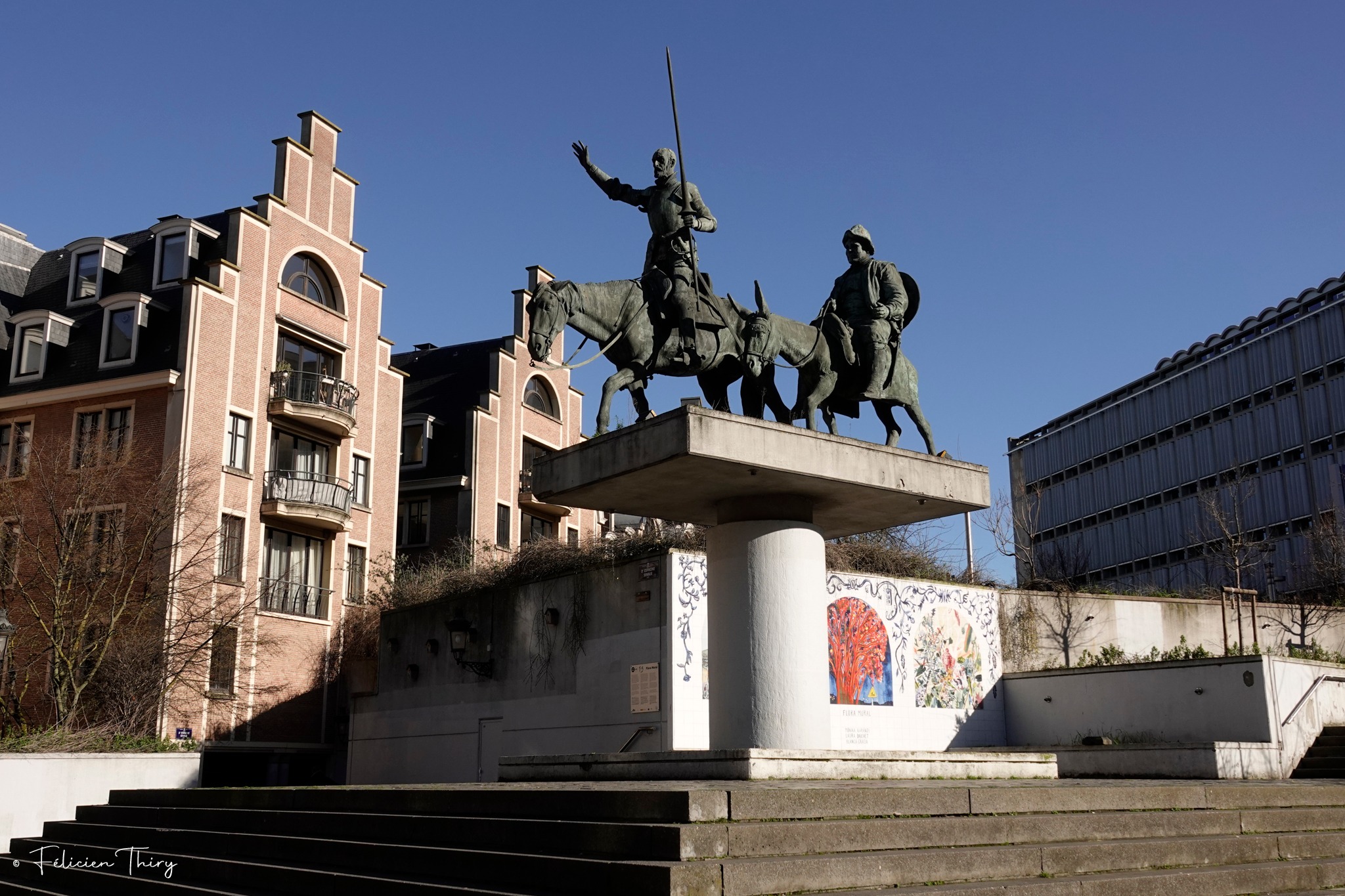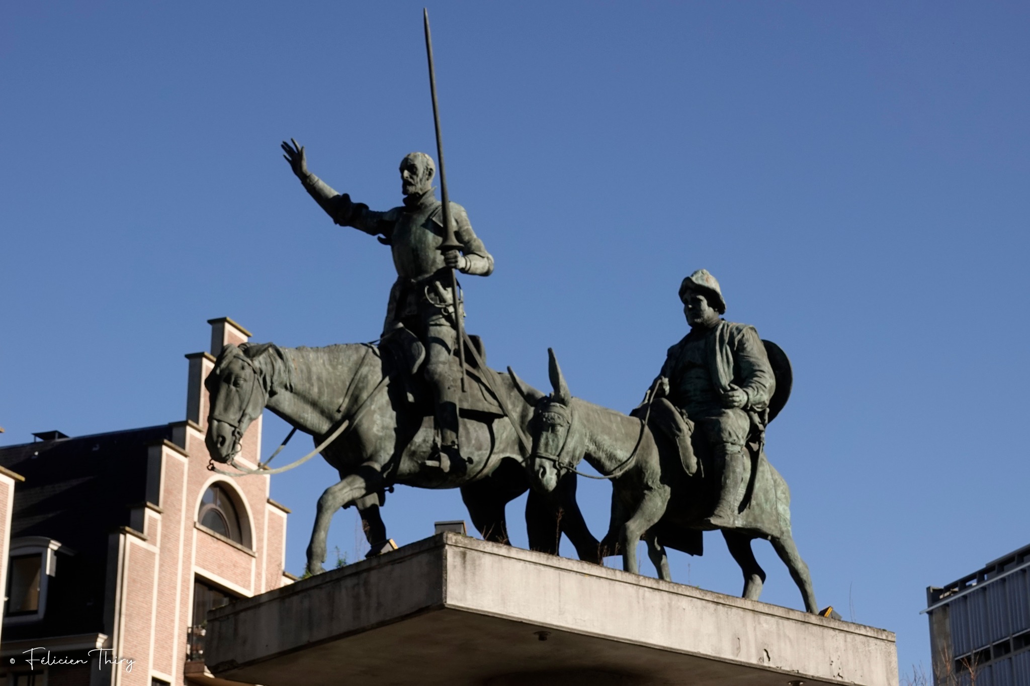 Les silhouettes de Don Quichotte et Sancho Panza symbolisent un contraste éternel : l’idéalisme flamboyant face au bon sens pragmatique. Le premier regarde loin devant, défiant des ennemis invisibles ; le second avance avec prudence, ancré dans le réel. Cette dualité, sculptée avec finesse, semble dialoguer avec la ville elle-même, Bruxelles, capitale à la fois politique, artistique et profondément surréaliste dans son âme.