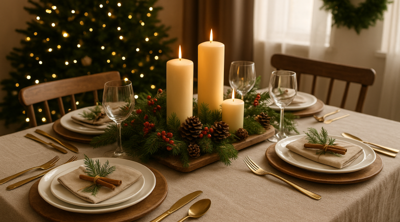 Les motifs traditionnels reviennent eux aussi : carreaux écossais, flocons délicats, pois dorés. Les rubans en velours font sensation, les serviettes se plient comme des étoiles, et les centres de table combinent petites pommes de pin, figurines en céramique, bougies sculptées et guirlandes scintillantes.