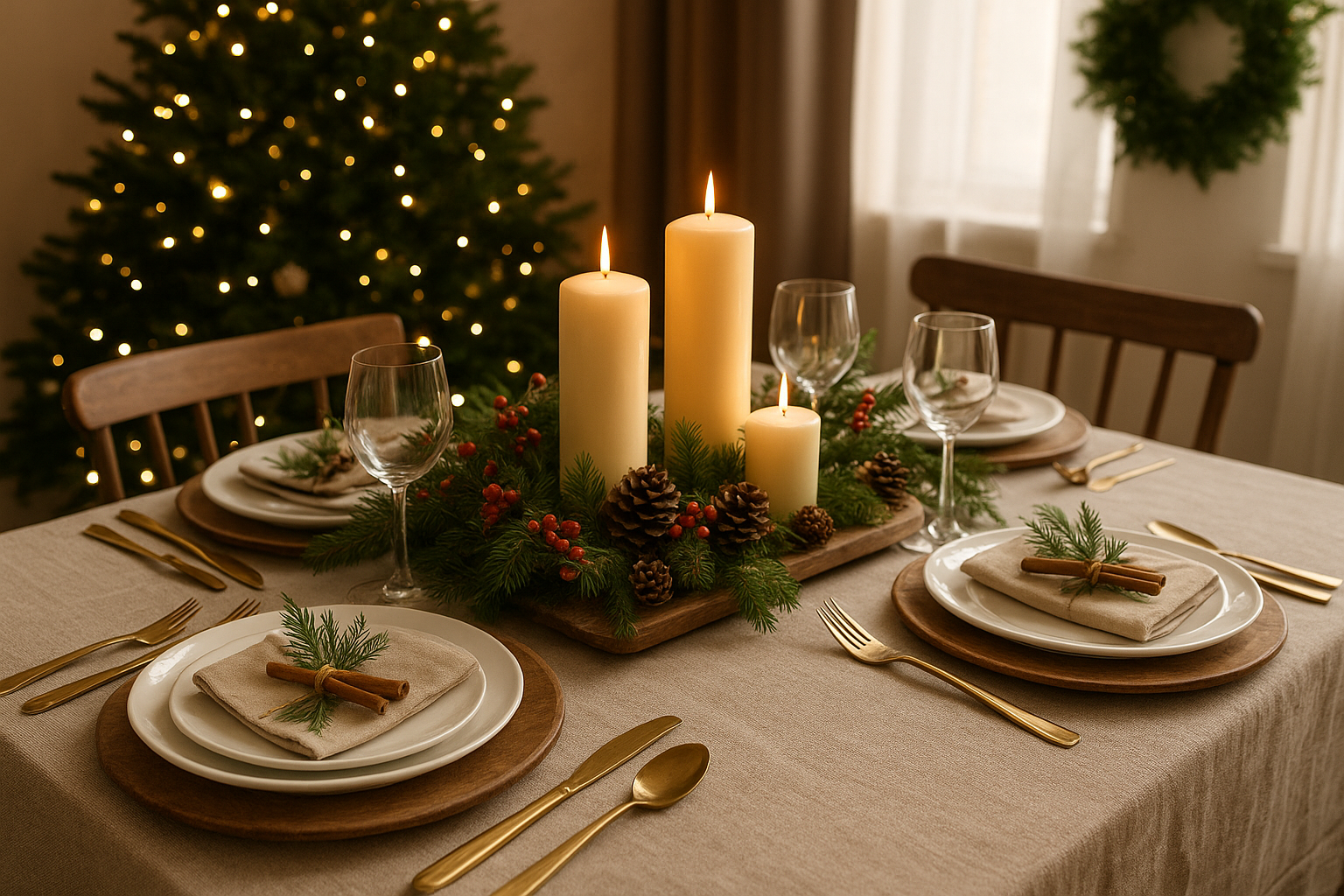 Le végétal occupe aussi une place centrale. Branches de sapin, eucalyptus, houx, laurier, romarin, brins de pin : ils apportent une fraîcheur naturelle à la table. En chemin de table, en couronne posée au centre, en petits fagots noués autour des serviettes… L’idée est de recréer une forêt miniature, parfumée et vivante.