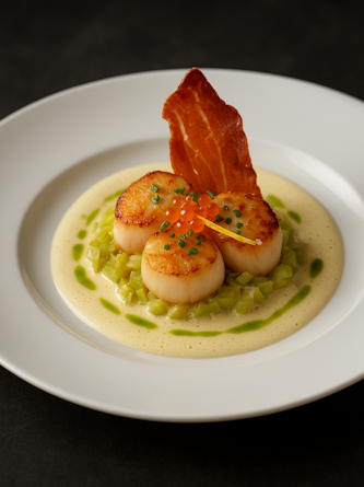 Une assiette délicate, jouant sur le contraste iodé / acidulé / croustillant / fondant, avec une Saint-Jacques parfaitement nacrée et une sauce digne d’une table étoilée.