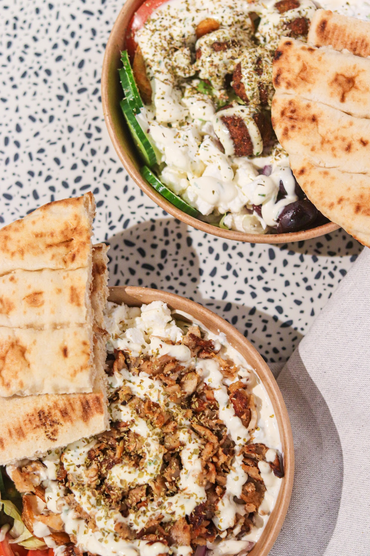 Chez Greek & Potatoes, tout tourne autour du gyros. En Grèce, cette star de la street food fait partie des grands classiques : un plat simple, généreux et plein de goût, que l’on attrape sur le pouce. Ici, il se décline dans une version fast-good pensée pour le quotidien, avec des produits frais venus de Grèce, un pain grec bien garni, des viandes au choix, des crudités, de la feta, un tzatziki maison, parfois relevé d’une touche de tirokafteri, de jalapeños ou même d’un œuf au plat. Sans oublier les versions au halloumi fondant, au miel de thym ou encore les bowls bien chargés, qui prolongent l’expérience dans un registre tout aussi gourmand.