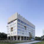 Le secondaire supérieur, ou bâtiment D2/3 conçu par MSA, constitue le repère visuel du campus. Ici, les architectes superposent classes, ateliers et espaces administratifs dans une école verticale de six étages. L’édifice repose sur de fins pilotis de béton, abritant une cour de récréation couverte et reliée à un hall d’entrée en double hauteur. À l’intérieur, larges couloirs, escaliers et terrasses s’enchaînent pour former un paysage intérieur dynamique.