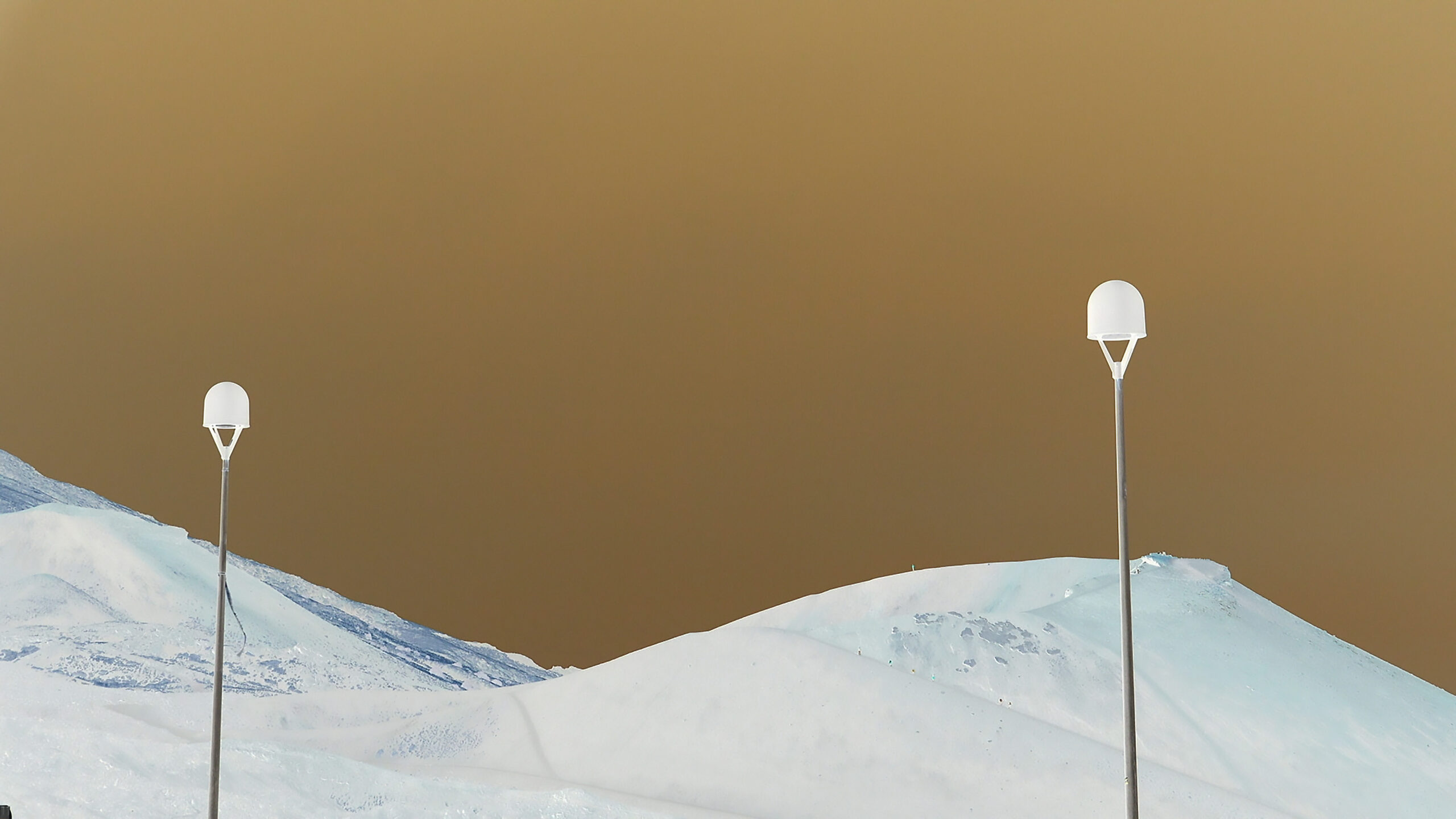 Nous y reconnaissons les éléments qui peuplent les paysages urbains d’aujourd’hui : panneaux de signalisation, lampes d’autoroute, caméras de surveillance, grues de chantier coupant le ciel.