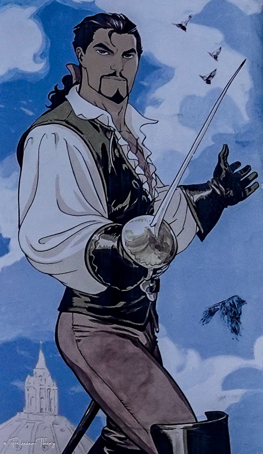 Cette œuvre met en scène un escrimeur élégant surgissant dans un ciel traversé d’oiseaux, suspendu entre la terre et l’imaginaire. Le personnage, vêtu d’une chemise ample aux accents Renaissance, d’un gilet sombre et de gants de duel, adopte une posture théâtrale : la lame tendue vers le spectateur, il semble à la fois défier et inviter. Son regard assuré, encadré d’une moustache et d’un bouc soigneusement taillés, évoque les héros romantiques des récits d’aventure — ces gentilshommes pour qui l’honneur valait plus que la vie.