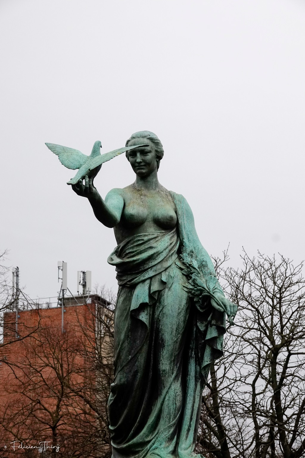 À l’ombre des façades anciennes du canal se dresse un hommage aussi discret que bouleversant : le monument dédié aux colombophiles belges morts pour la patrie et à leurs pigeons soldats. Inauguré en 1931 et réalisé par le sculpteur Victor Voets, cet ensemble sculpté rappelle une page méconnue mais essentielle de l’histoire de Belgique : celle des combattants ailés.