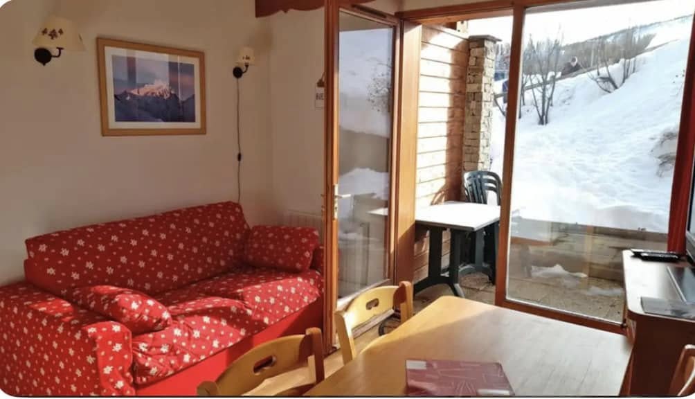 Rez-de-chaussée, exposé sud-est avec terrasse, piscine chauffée commune à la résidence (en été) et accès aux pistes de ski à 30 m.