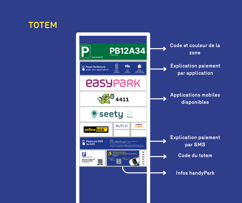 Quant aux totems, ils visent à informer clairement les automobilistes du type de zone dans laquelle ils se garent, des modes de paiement à leur disposition, du dispositif handyPark destiné aux personnes titulaires d’une carte européenne de stationnement pour personne en situation de handicap, ainsi que du code propre au totem permettant d’identifier sa position.