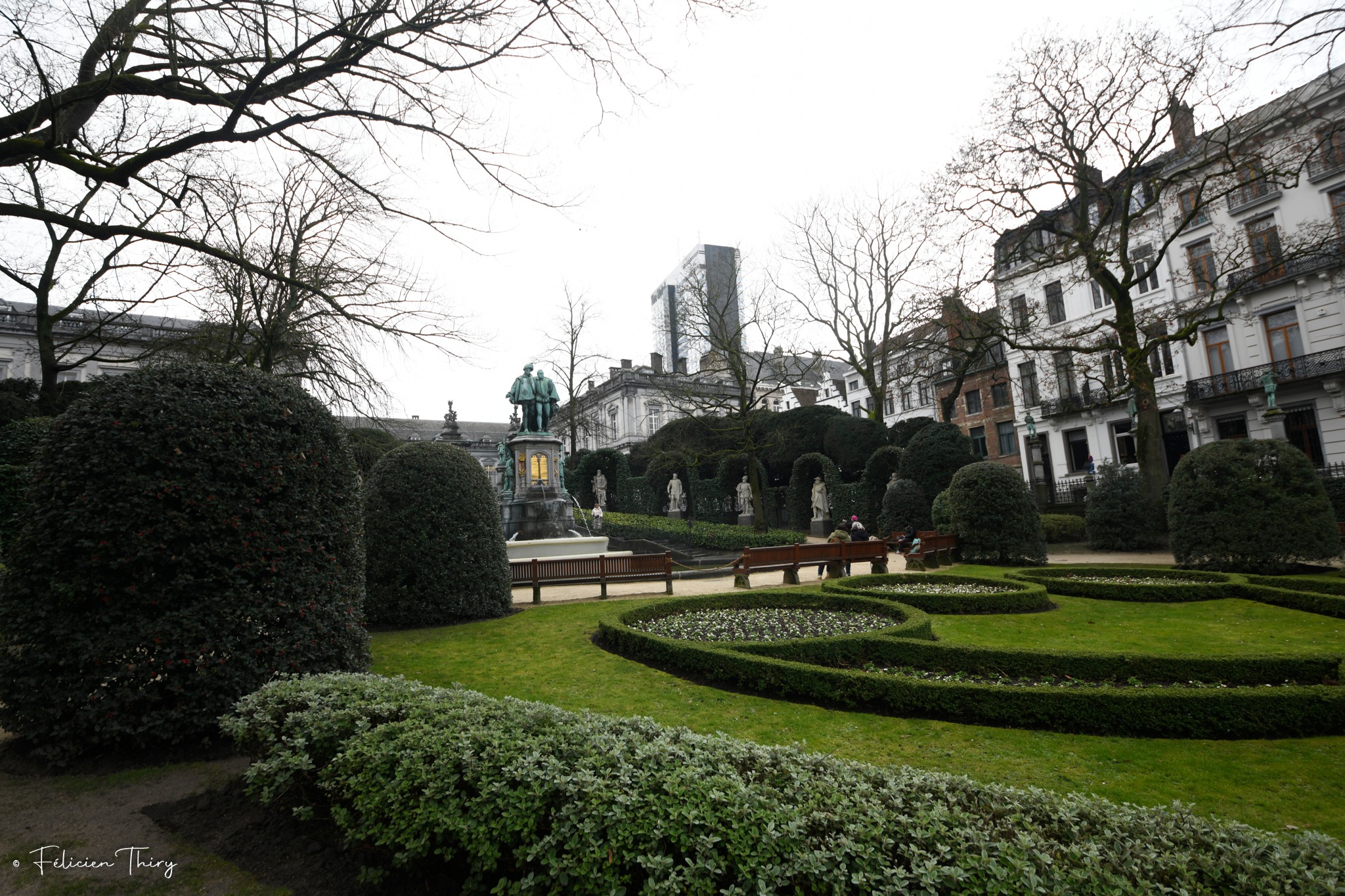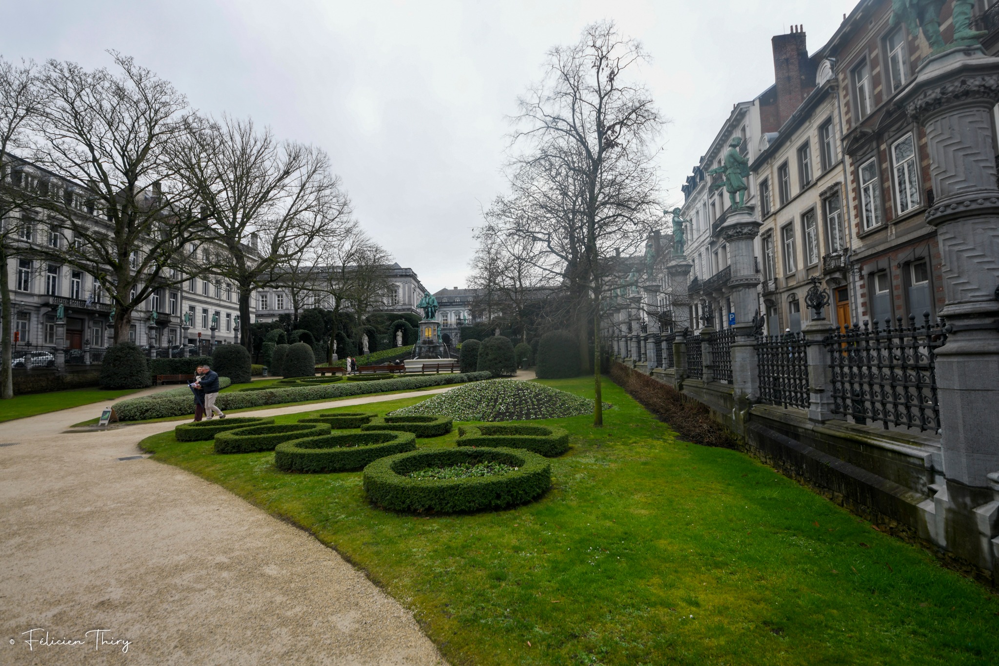 L’ensemble du square est ceinturé d’une grille en fer forgé remarquable, composée de panneaux aux motifs variés et de colonnades élégantes, qui renforce le caractère raffiné et artistique du site. Chaque élément – sculptures, végétation, fontaine, grilles – contribue à créer une expérience harmonieuse, où l’histoire, l’art et la nature se rencontrent au cœur de Bruxelles.