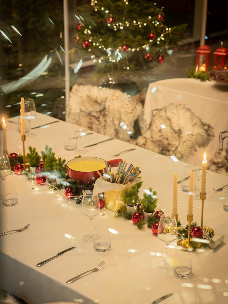 La formule proposée dans le dôme repose sur les grands classiques de l’hiver. Raclette suisse traditionnelle, fondue aux trois fromages d’exception, options aux morilles ou à la truffe noire pour les amateurs de saveurs plus raffinées : chaque groupe construit son repas autour d’un choix de fondues et de fromages soigneusement sélectionnés. Les menus incluent des accompagnements généreux, avec charcuteries, pommes grenaille rôties, quignons de pain rustique, légumes grillés, pickles maison, condiments d’hiver, sauces et chutneys. L’idée est simple : un repas complet à partager au centre de la table, où chacun se sert, prend le temps et profite de l’ambiance.