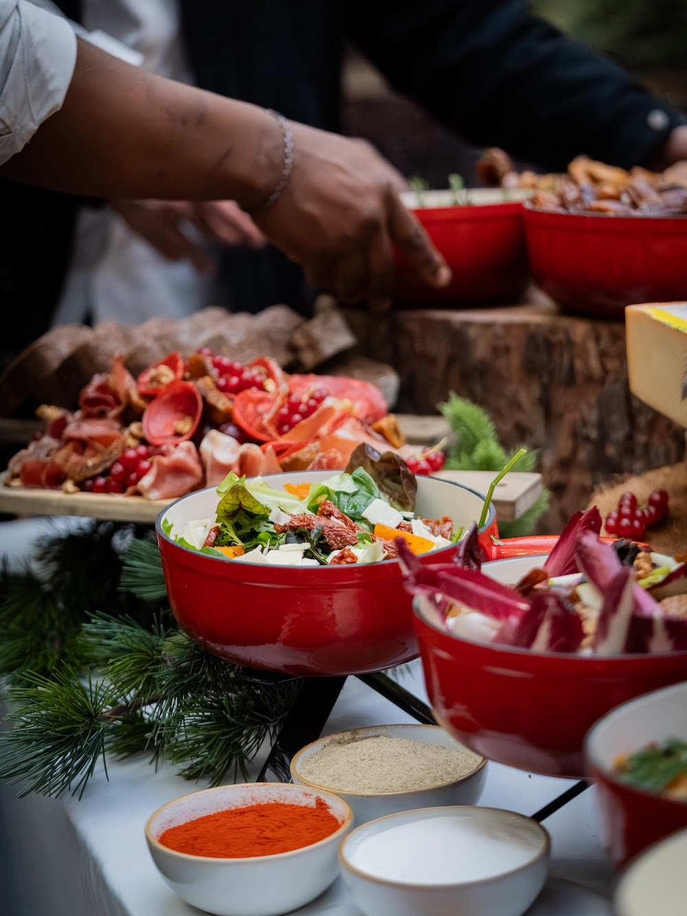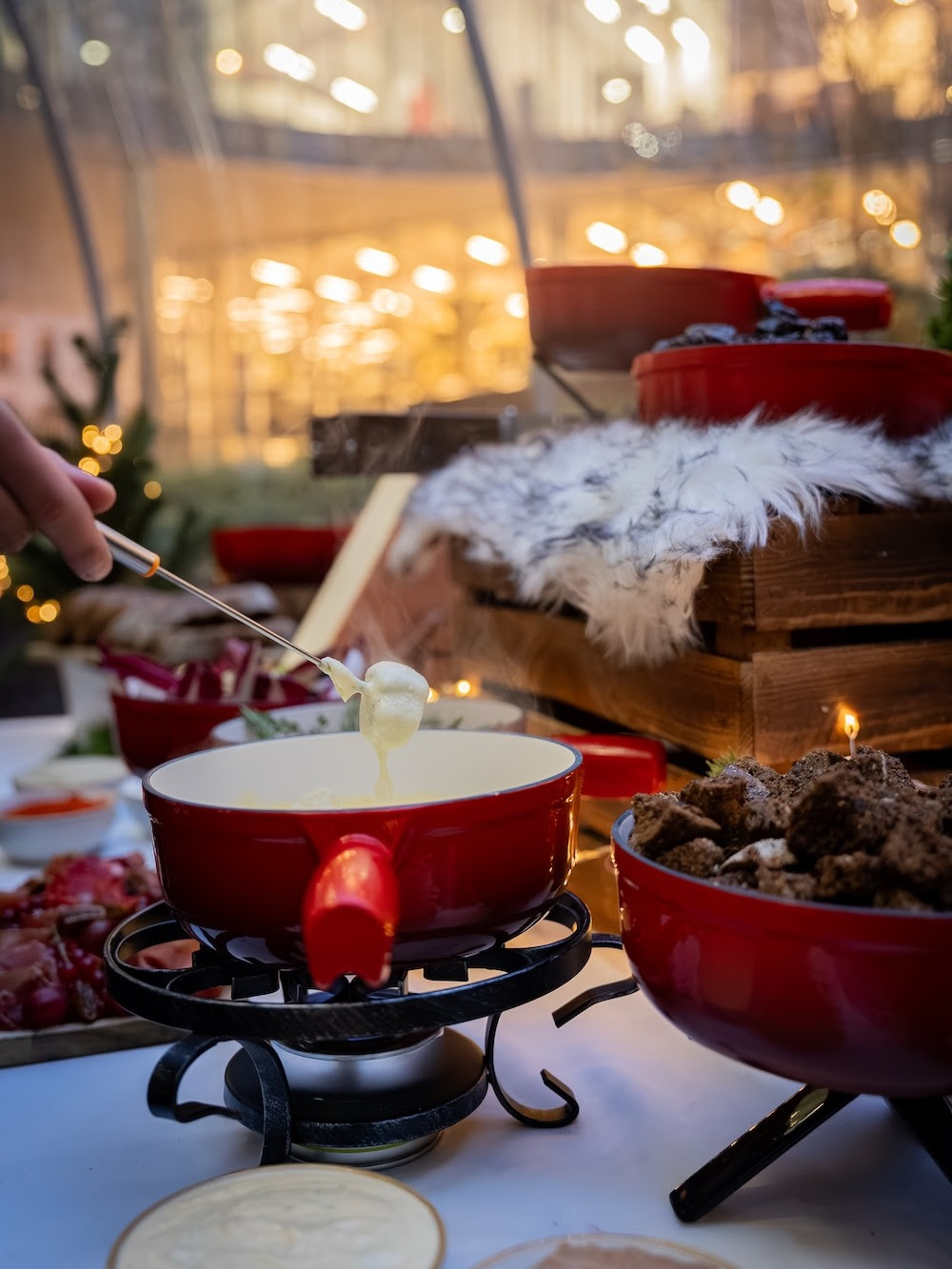 La formule proposée dans le dôme repose sur les grands classiques de l’hiver. Raclette suisse traditionnelle, fondue aux trois fromages d’exception, options aux morilles ou à la truffe noire pour les amateurs de saveurs plus raffinées : chaque groupe construit son repas autour d’un choix de fondues et de fromages soigneusement sélectionnés. Les menus incluent des accompagnements généreux, avec charcuteries, pommes grenaille rôties, quignons de pain rustique, légumes grillés, pickles maison, condiments d’hiver, sauces et chutneys. L’idée est simple : un repas complet à partager au centre de la table, où chacun se sert, prend le temps et profite de l’ambiance.