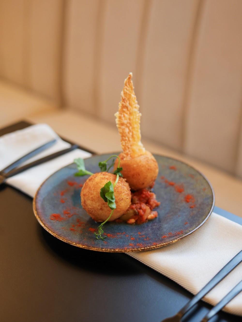 Au rez-de-chaussée, OBIOSE déploie l’âme de son restaurant bistronomique, une table méditerranéenne contemporaine aux accents généreux, portée par une carte volontairement resserrée qui change au rythme des saisons. Huit entrées, huit plats et cinq desserts seulement, tous faits maison, comme un manifeste de sincérité et de maîtrise. Une caponata gourmande parfumée aux herbes, des croquettes de chorizo qui réveillent l’appétit, des assiettes qui évoquent le soleil et les rivages du Sud : ici, la cuisineprivilégie le goût, la justesse et une forme de simplicité assumée, loin des effets de manche.