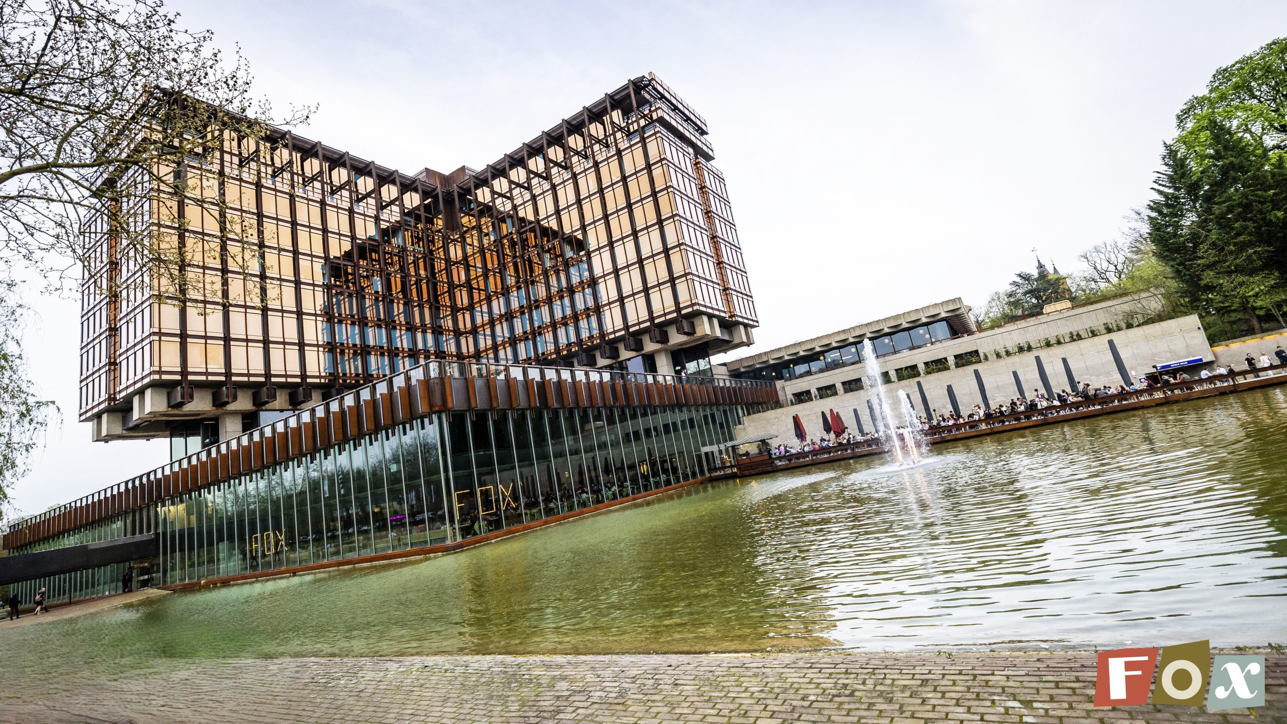 Le bâtiment, doté de larges baies vitrées et situé en bordure de la Forêt de Soignes, dispose d’une grande terrasse surplombant un plan d’eau artificiel.