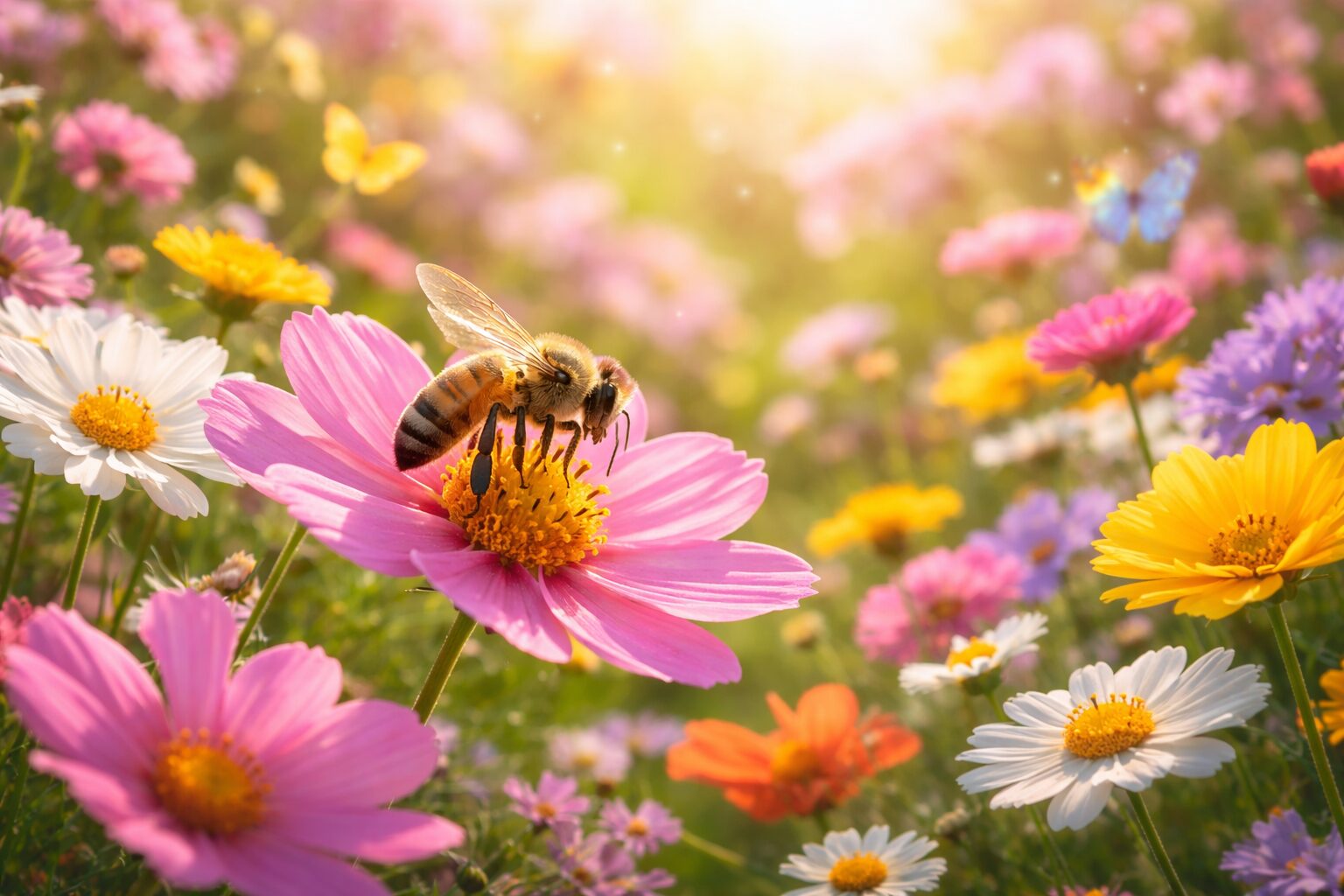 Chaque détail semble raconter une histoire : les couleurs vibrantes, les tiges qui se redressent, la rosée encore présente sur les feuilles. Le silence est ponctué par ce léger bourdonnement, presque apaisant, qui accompagne le spectacle. On a l’impression que tout respire à nouveau, que la saison froide n’est plus qu’un souvenir lointain.